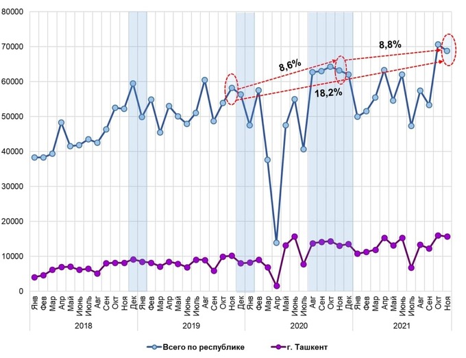 Объём автокредитов, выданных за 11 месяцев, составил 7,8 трлн сумов — на 40% больше, чем год назад. В Ташкенте и Бухарской области этот показатель вырос более чем вдвое.