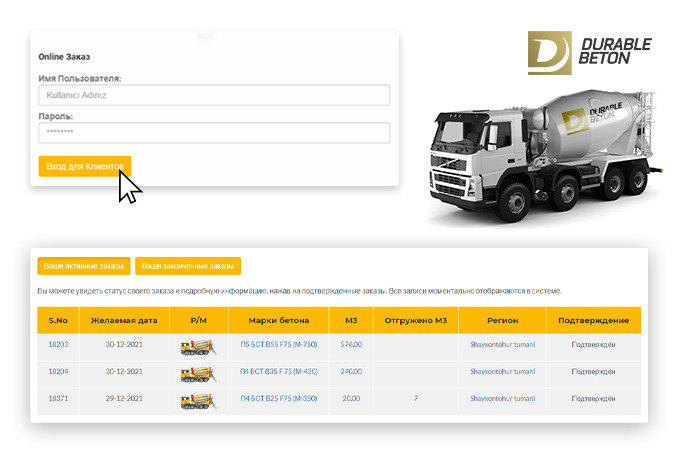 При заказе бетонных смесей, в особенности крупных партий, заказчик сталкивается с рисками. Каков статус заказа, в пути ли и где он сейчас находится — эти вопросы возникают из-за непрозрачности процедуры поставки. Как раз эту проблему решает сервис онлайн-мониторинга заказа в компании Durable Beton.