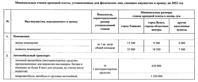 Президент Шавкат Мирзиеёв подписал закон о государственном бюджете на 2022 год. Документ утверждает новые минимальные ставки арендной платы для физических лиц, сдающих в аренду помещения и автотранспорт. Об этом сообщает пресс-служба ГНК.