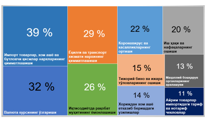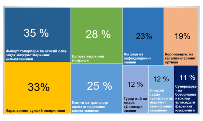 Первое место среди факторов инфляции занял рост цен на импортные товары и продовольствие — его назвали 35% участников, далее идёт завышение цен с 33%. Изменение обменного курса (28%) и подорожание топлива (25%) отошли на второй план.