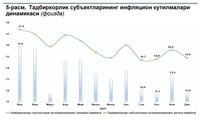 Среди предпринимателей ожидаемый уровень также упал. Медианный показатель сократился на 1,6%, до 11,8%. Средний также стал меньше на 0,7% — сейчас он равен 14,9%.