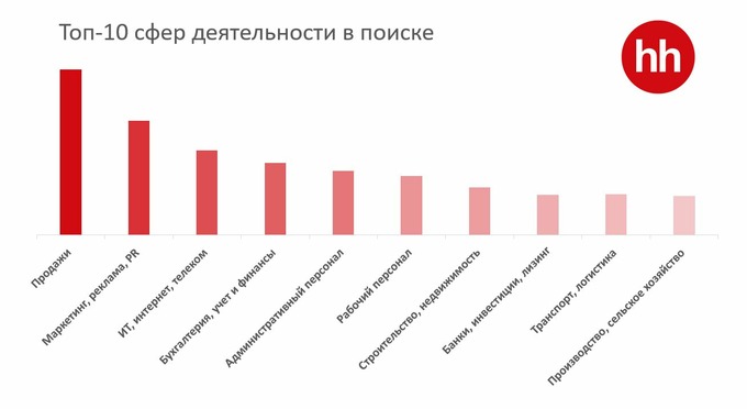 Эксперты hh также проанализировали запросы соискателей по предпочитаемой сфере деятельности. Наиболее востребованной оказалась сфера продаж, вторая по популярности сфера деятельности в запросах пользователей — маркетинг, реклама и PR, третье место у IT. В пятерке самых популярных также оказались бухгалтерия, учет, финансы и административный персонал.