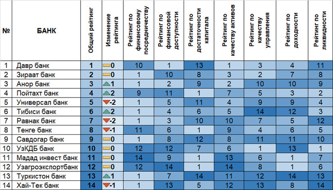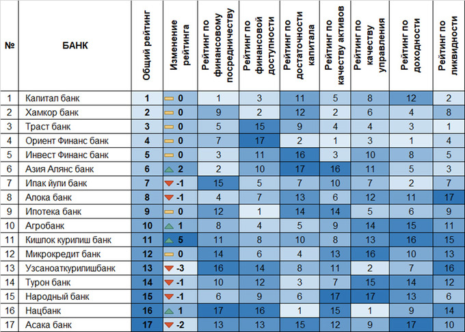 Qishloq Qurilish Bank за счёт роста кредитного портфеля и ликвидности вышел на 11-е место, улучшив положение сразу на 5 позиций. Также заметно поднялись показатели Asia Alliance Bank (6-е место, на две строчки выше) и «Агробанка» (10-е место, +1 строка).