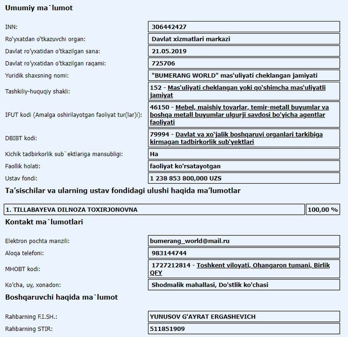 По данным ЕГРПО, компания Bumerang World учреждена в мае 2019 года и занимается оптовой продажей мебели, бытовых товаров и изделий из железа. Уставной капитал — 1,24 млрд сумов.