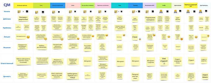 В результате исследования мы определили больше 130 проблем, с которыми сталкиваются при выборе вуза. Опросили порядка 50 респондентов. Создали пять CJM (customer journey map — карта пути клиента).