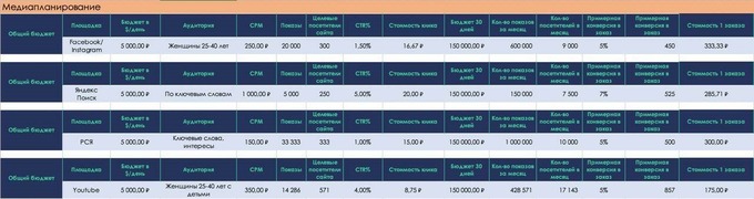 Очень важно спрогнозировать стоимость привлеченного клиента. Медиаплан поможет держать в фокусе все расходы и конверсию.