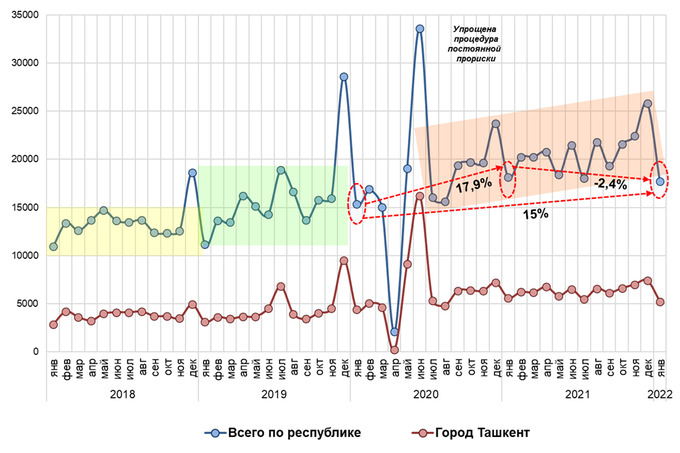 С другой стороны, в Ташкентской области активность снизилась на 17,6%, в Каракалпакстане — на 14,4% и в Ташкенте — на 6,7%.