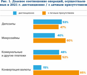 В 2021 году 53% оформленных депозитов, 40% полученных микрозаймов, 48% коммунальных и других платежей и 15% транзакций по валютной конвертации произведены дистанционно.