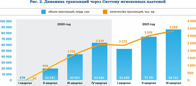 Внедрение в 2020 году системы мгновенных платежей — онлайн-переводов денежных средств между юрлицами и ИП — привело к резкому росту доли безналичных расчётов в экономике. В III квартале 2021 года количество транзакций в системе достигло 3,3 млн на общую сумму 86,1 трлн сумов.