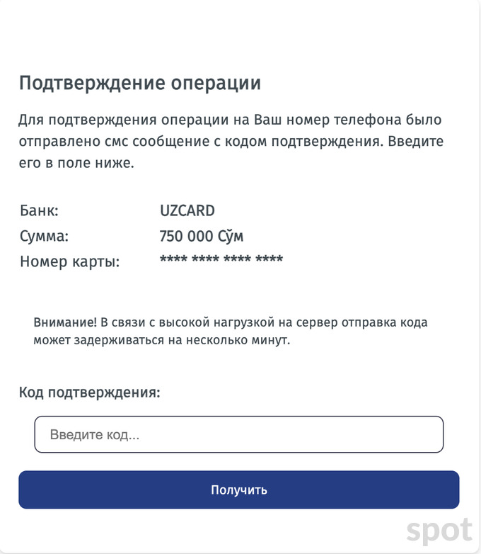 После на указанный номер телефона приходит SMS-сообщение, которое нужно ввести на сайте.