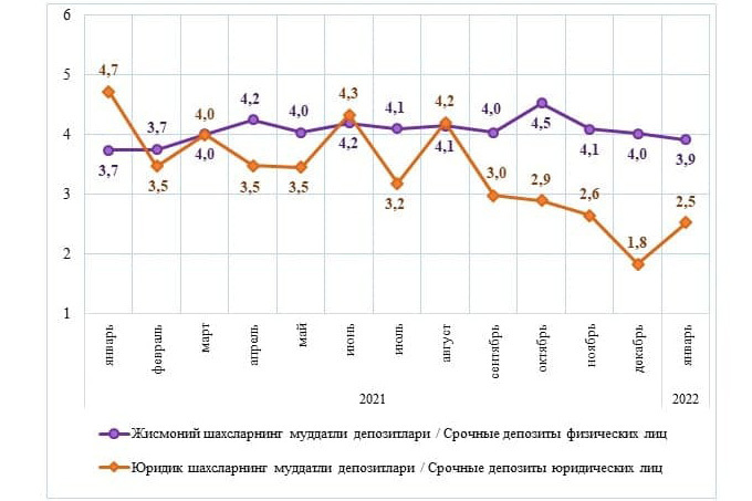 Средняя процентная ставка по банковским вкладам в сумах для населения в январе составила 20,2%, следует из данных Центробанка.