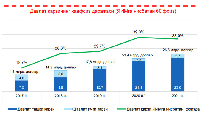 Узбекистан за год привлёк $4,9 млрд новых внешних заимствований при установленном лимите в $5 млрд. В рамках мер по борьбе с дефицитом бюджета лимит новых кредитов в 2022 году сокращён до $4,5 млрд.