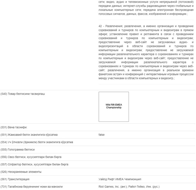 Компания Riot Games подала заявку на регистрацию в Узбекистане товарного знака Wild Rift EMEA Championship, следует из данных системы «Интеллектуал мулк» Агентства по интеллектуальной собственности.