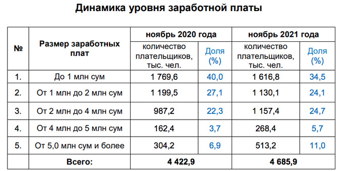 - По НДФЛ поступления составили 18,9 трлн сумов (+3,8 трлн). В частности, удерживаемый работодателями у источника выплаты налог составил 17,5 трлн сумов, рост — 3,4 трлн сумов. На показателе, в том числе отразилась позитивная динамика уровня зарплат в стране.