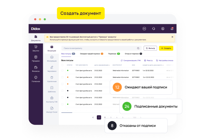 При использовании системы закупок Didox задача создания, подписания, отправки и контроля статуса договора делается по щелчку пальцев. Время и человеческие ресурсы могут быть затрачены не на этот контроль, а на достижение целей бизнеса.