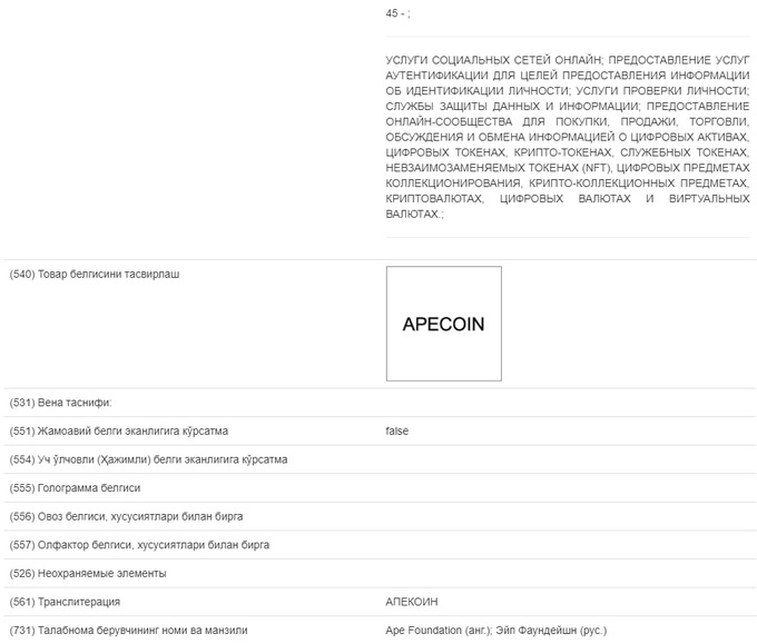 В Агентство по интеллектуальной собственности поступила заявка о регистрации товарного знака Apecoin, принадлежащего APE Foundation. Соответствующая запись появилась в базе данных «Интеллектуал мулк».
