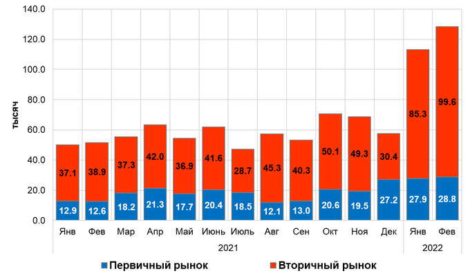 Сильнее рос вторичный рынок — здесь число купленных авто за месяц составило 99,6 тысяч (+16,8%). На первичном рынке в феврале продано 28,8 тысяч машин, что на 3,2% больше, чем месяцем ранее.