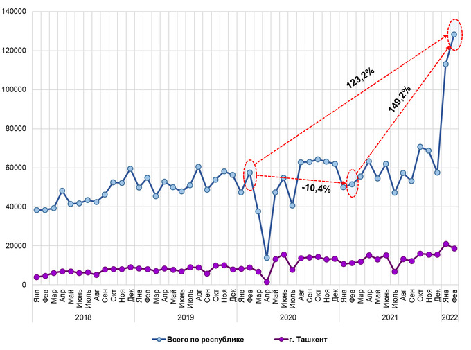 Число зарегистрированных авто за месяц достигло 128,4 тысяч — это на 149,2% больше, чем было в феврале прошлого года (51,5 тыс.) и на 123,2%, чем в январе 2020 года (57,5 тыс.). Рост по сравнению с январём текущего года составил 13,4%.