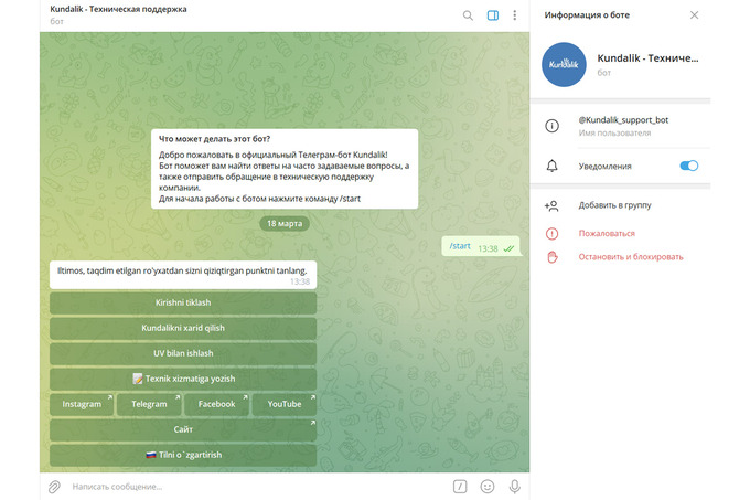 «Telegram — привычный для многих в Узбекистане мессенджер, в котором теперь можно в несколько кликов отправить запрос в службу поддержки, получить ответ и в любое время возвращаться к полученной информации. База ответов всегда будет в чате бота в вашем смартфоне», — добавила она.