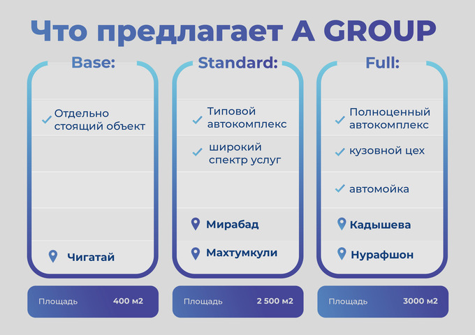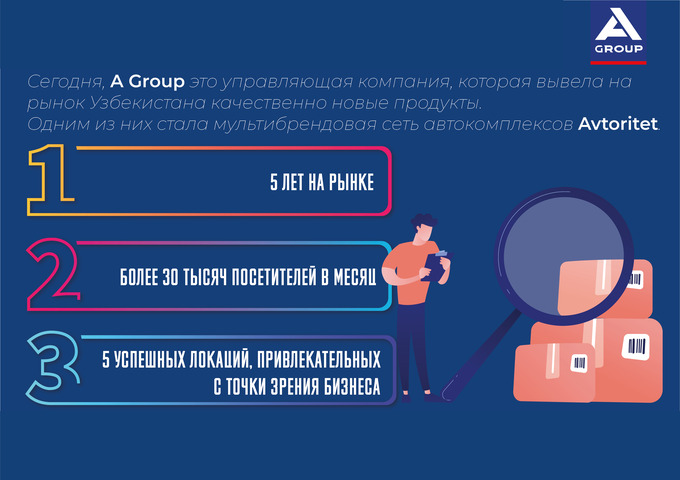 Сегодня A Group — это управляющая компания, которая вывела на рынок Узбекистана качественно новые продукты. Одним из них стала мультибрендовая сеть автокомплексов AVTOritet.