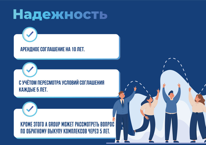 Арендное соглашение заключается на 10 лет с учетом пересмотра условий соглашения каждые 5 лет. Кроме этого, A Group может рассмотреть вопрос по обратному выкупу.