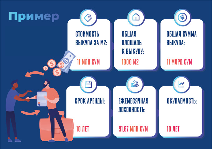 Также есть возможность выкупа здания автокомплекса по 11 млн сумов за квадратный метр — это выгодная инвестиция. Например, если выкупить 1000 кв. м за 11 млрд сумов, со средней арендной платой в 91,67 млн сумов в месяц можно окупить площадь за 10 лет сдачи в аренду.