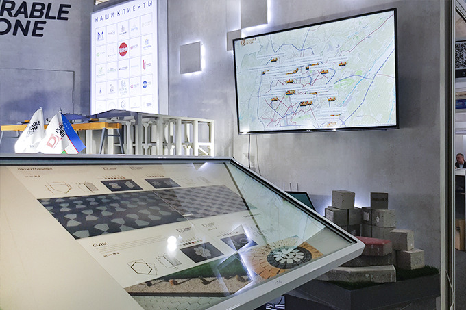 Представители компании приняли нестандартное и креативное решение. Они замостили подиум стенда брусчаткой, чем наглядно показали ее эксплуатационные характеристики и презентабельный вид.