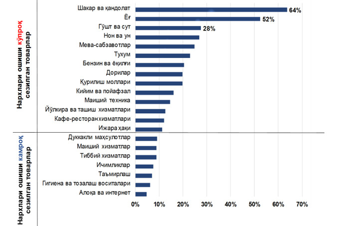 - Продовольственная инфляция вышла на первое место и для домохозяйств с 4−5 млн сумов дохода — 10,3% (к январю +1%). Рост цен на промтовары для них составил 10,2%.
