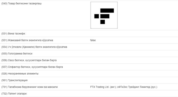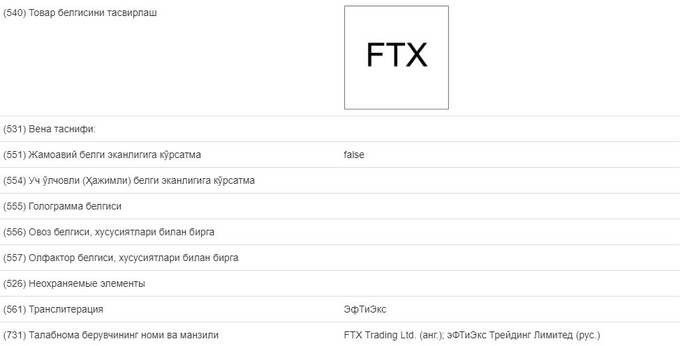 Компания FTX Trading Ltd. подала заявку на регистрацию в Узбекистане своих товарных знаков. Соответствующая запись появилась в базе данных «Интеллектуал мулк».