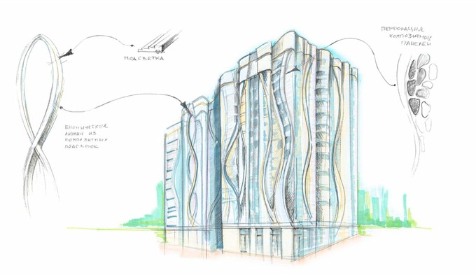Проект полностью основан на концепции бионического стиля. В архитектуру Skyline Towers гармонично вписаны плавные природные линии, которые обтекают все здание. Фасад выполнен в естественных оттенках: это переливающаяся жемчужная отделка композитными панелями и золотистые элементы.