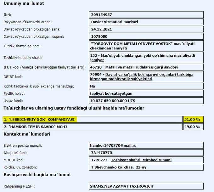 Ещё 49% компании-покупателя владеет ООО Hamkor Temir Savdo, главным учредителем которого выступает компания Metall West. Единственным учредителем последней значится Дильмурод Пулатов.