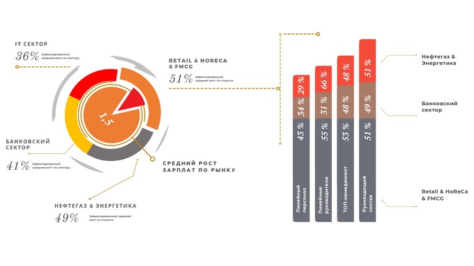 Так, самый высокий рост в размерах заработных плат наблюдался среди линейных руководителей инженерно-технического состава, занятых в сферах нефтегаза и энергетики (66%). На втором месте по уровню увеличения размеров компенсаций за труд расположились линейные руководители Retail, HoReCa и FMCG (55%). Рост зарплаты в среднем в 1,5 раза был зафиксирован среди сотрудников руководящих должностей и топ-менеджмента в банковском секторе, нефтегазовой и энергетической отраслях, а также в Retail, HoReCa и сегменте производства и продажи товаров массового потребления.