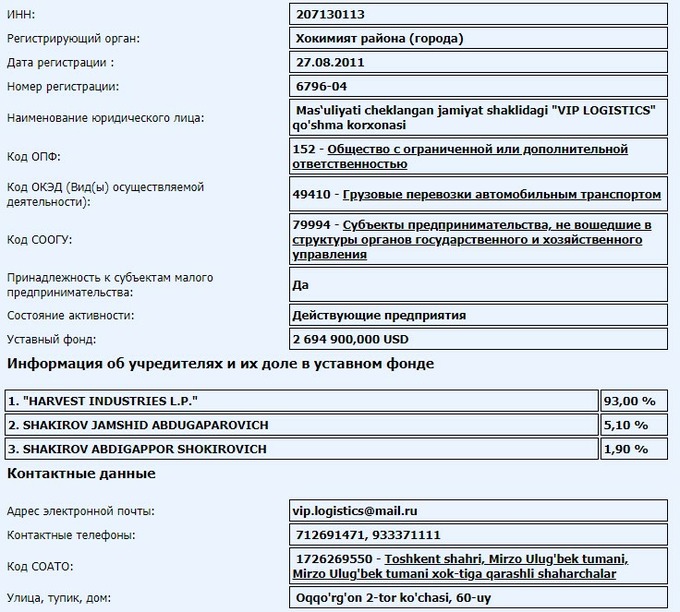 По данным британского правительственного регистра Companies House, Harvest Industries LP была зарегистрирована в Шотландии в 2012 году. Контролирующим лицом значится резидент Узбекистана Тахир Икрамов.