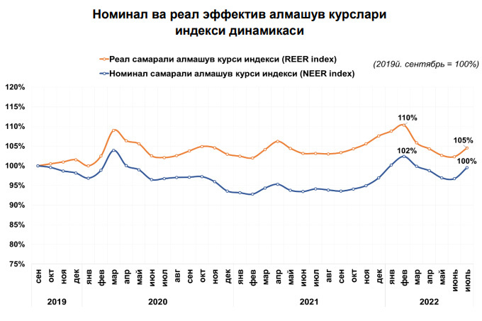 По отношению к тому же периоду 2021 года сум по фактическому курсу укрепился на 1,4%. Показатель сдвинулся вверх впервые после четырёх месяцев падения — до этого в июне он просел на 0,2%.