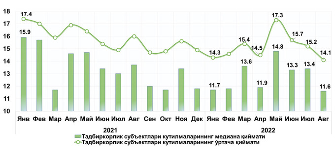 Между тем ожидания бизнеса по инфляции достигли минимума как минимум с начала 2021 года. Средний процент в августе составил 14,1% и снизился на 1,1%. Ещё более резко снизился медианный уровень — 11,6%.