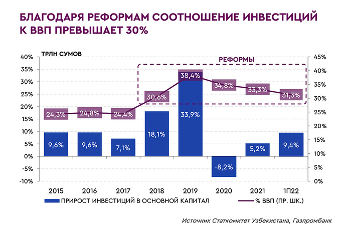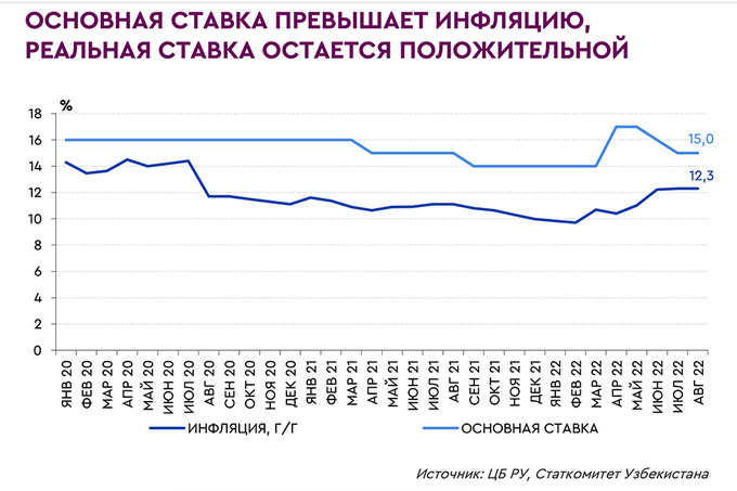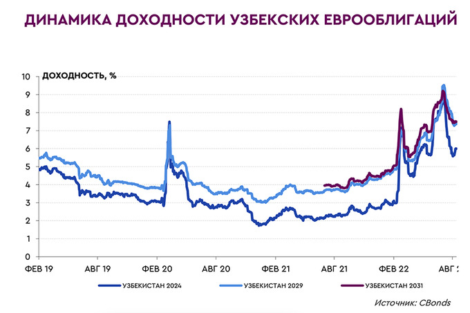 С начала 2019 года его объем вырос в 22 раза. Мы позитивно смотрим на высокодоходные выпуски в узбекских сумах с погашением в 2023—2024 годах. Например, в США в июле инфляция составила 8,5% при ставке 2,5%, а в Узбекистане остается стабильной и в августе составила 12,3% при высокой основной ставке (15%).