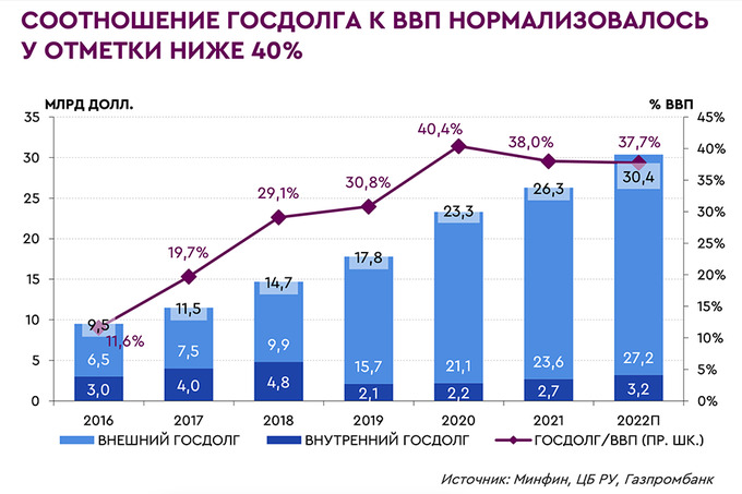 Ни один из сценариев стресс-теста (привлечение госдолга в максимальном объеме $4,5 млрд в 2022 году) не показал превышения госдолгом отметки 60% ВВП. В связи с этим Минфин создал систему управления госдолгом и уделяет больше внимания снижению валютных рисков.