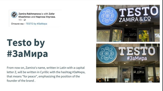 Так, пельменная поменяла вывеску. Отныне имя Замиры, написанное латиницей с большой буквы Z, будет писаться кириллицей с хэштегом #ЗаМира, что означает «за мир», подчеркивая позицию основательницы бренда.