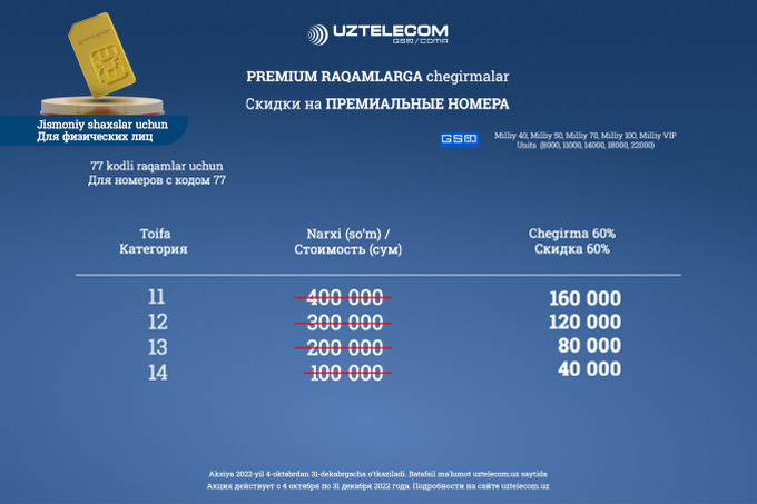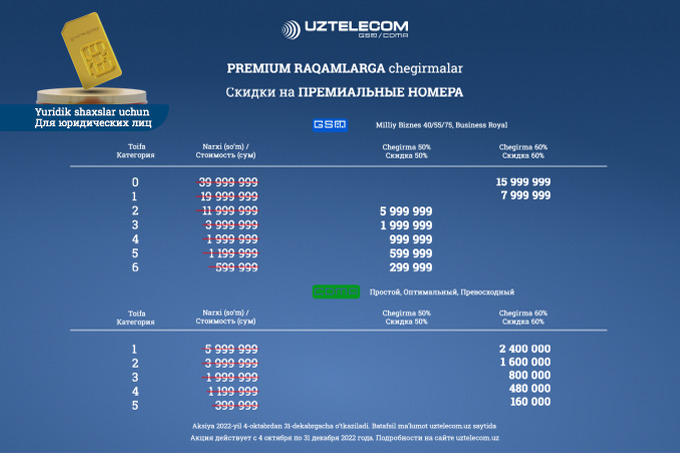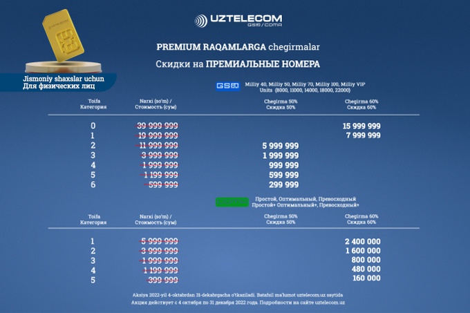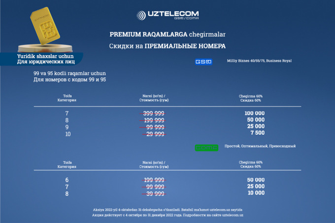 UZTELECOM объявляет акцию с большими скидками на премиум-номера. Приобрести желанный номер с выгодой до 60% можно при подключении на действующие тарифные планы.
