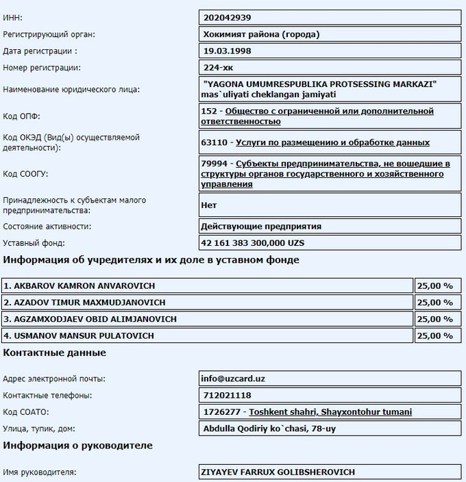 Обид Алимджанович Агзамходжаев, Камрон Анварович Акбаров, Тимур Махмуджанович Азадов и Мансур Пулатович Усманов сейчас владеют по 25% в компании-операторе UZCARD. Ранее их общая доля составляла 25%.