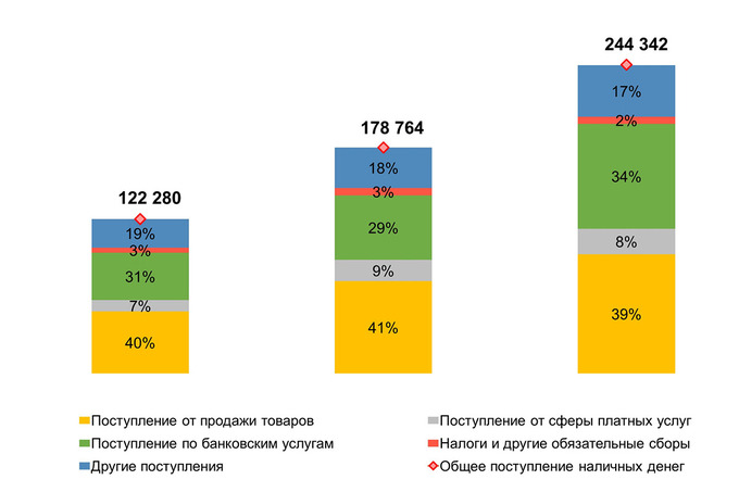 Поступления от продажи товаров выросли на 27,5% — однако их доля в общей структуре прихода немного снизилась (39% против 41%). С другой стороны, заметно вырос приход денег по банковским услугам, а его доля достигла 34%.