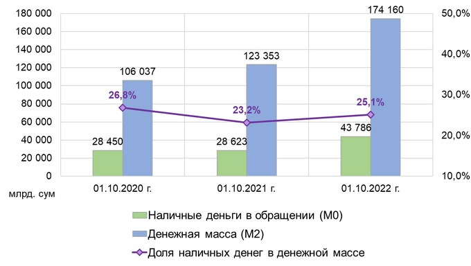 Для покрытия спроса ЦБ выпустил 15,8 трлн сумов наличными за девять месяцев (в том числе около 4 трлн — в июле-сентябре). Всего в обороте на начало октября находилось 43,78 трлн сумов наличности при общей денежной массе в 174,16 трлн.