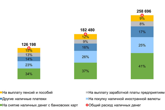 Расход наличности составил 258,6 трлн сумов, поднявшись на 41,8% (76,2 трлн сумов). В его структуре продолжает расти доля снятия денег с карт в банкоматах — с 37% в прошлом году до 41% сейчас. Доля зарплаты, наоборот, упала с 9% до 8%.