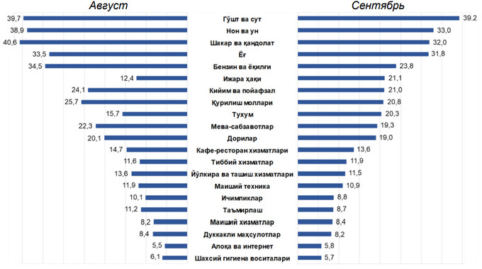 - Цены на продовольствие росли с опережением в Каракалпакстане, Хорезме, Навои, Сурхандарье, Сырдарье, Намангане и Андижане. Меньше всего питание подорожало в Джизаке (15,5%), Ташкенте и Самарканде (по 15,9%).