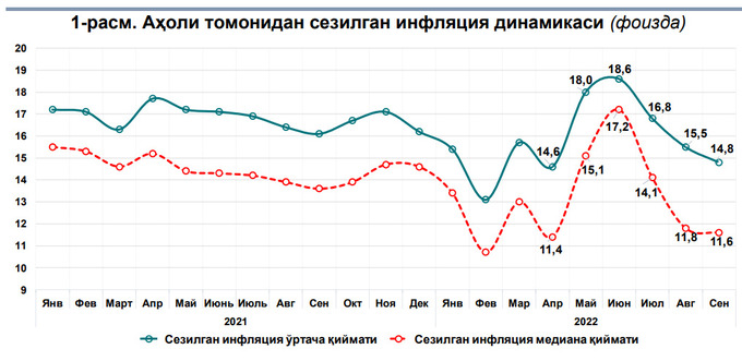 Для сравнения, в августе узбекистанцы оценили инфляцию в 15,5% при расчёте по среднему арифметическому и 11,8% — по медиане. Месяцем ранее показатели составили 16,8% и 14,1% соответственно.