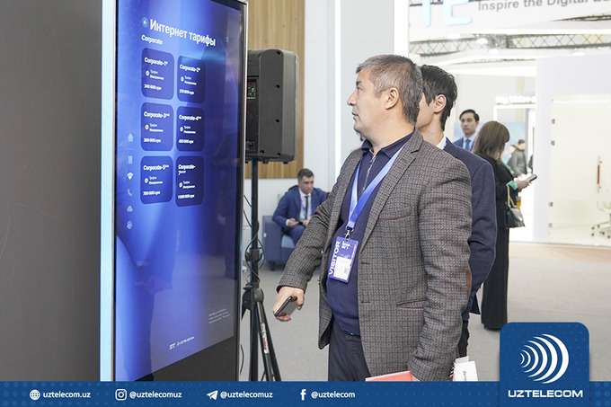 В частности, стенд UZTELECOM был разделен на несколько интерактивных зон, где гости ознакомились со всеми услугами, оказываемыми компанией. На первом этаже стенда UZTELECOM распологались зоны самообслуживания, интерактивной виртуальной реальности, презентации продуктов компании, включая облачные сервисы, ОТТ-платформы, а также зона подключения к услугам. На втором этаже были созданы условия для проведения важных переговоров и встреч.