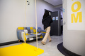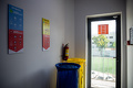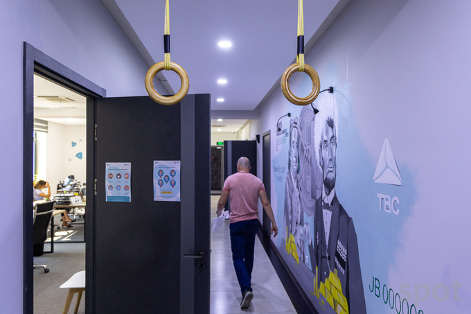 В прогрессивном банке — прогрессивные условия. На входе стоит система распознавания лица Face ID. Яркие акцентные стены с вдохновляющими надписями, брусья и кольца, чтобы размяться после долгой напряженной работы.