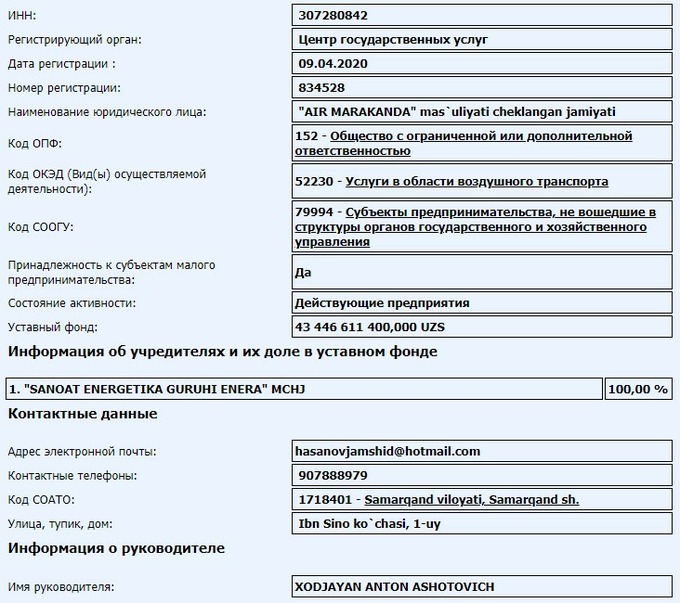 В свою очередь, Sanoat Energetika Guruhi Enera принадлежит 100% доли в компании Air Marakanda. В 2021 году Uzbekistan Airports выбрала последнюю оператором Самаркандского аэропорта на основе ГЧП, что было закреплено Кабмином в мае этого года. Руководителем Sam Air и Air Marakanda по ЕГРПО числится Ходжаян Антон Ашотович.