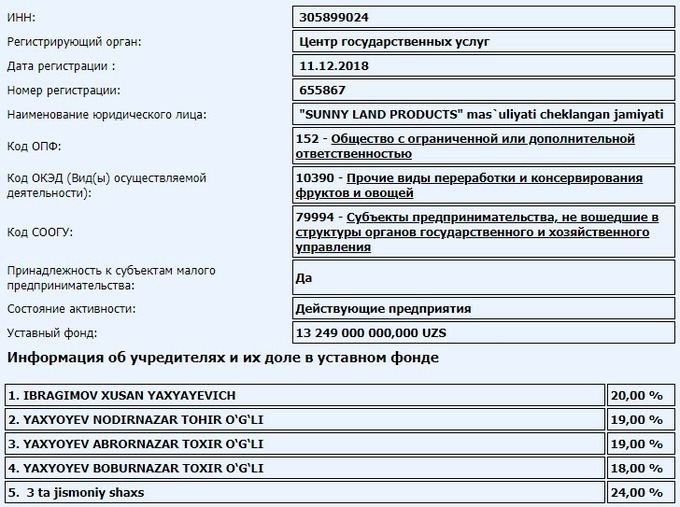 По данным из ЕГРПО, ООО Sunny Land Products было учреждено в 2018 году, занимается переработкой и консервацией плодоовощной продукции.