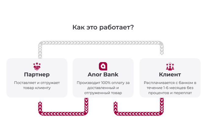 С «Бизнес поддержкой» производитель или дистрибьютор отгружает товар своему клиенту, а ANORBANK производит 100-процентную оплату производителю или дистрибьютору вместо клиента с вычетом комиссии банка. Получатель товара в течение 1−6 месяцев расплачивается с банком, при этом не переплачивая за товар ни копейки.
